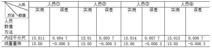 分别采用三丰两爪内径千分尺5-25mm(345-250-10),成量量块112块 0级。检测结果如表4所示,三坐标测量机检测结果是15.006 3mm。